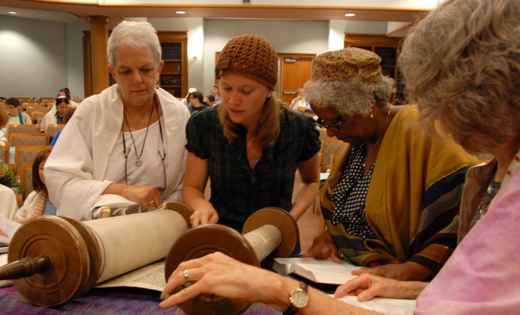 Note the identification of Nannette Herlands (DC Minyan), Torah reader, and Sabrina Sojourner (Temple Micah and Temple Beth Emet [independent]), Gabbai. These two women are visible in this photo — the one in the hat, reading the Torah, and the one in tallit and kippa serving as gabbai, respectively — along with two women (no head coverings) who had been called to the Torah for aliyot.