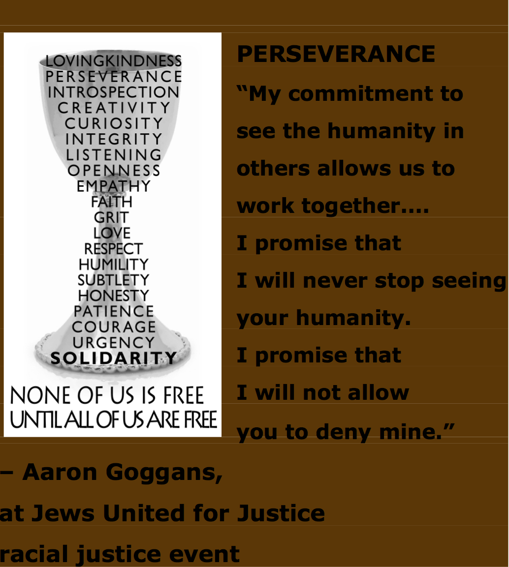 In the spirit of gevurah as strength, I suggest we begin this week by honoring the strength of individuals of color, persevering in a society that too often sees them in ways that do not celebrate their humanity. In the spirit of gevurah as boundaries, I suggest we begin this week by honoring the many different routes such perseverance can take.