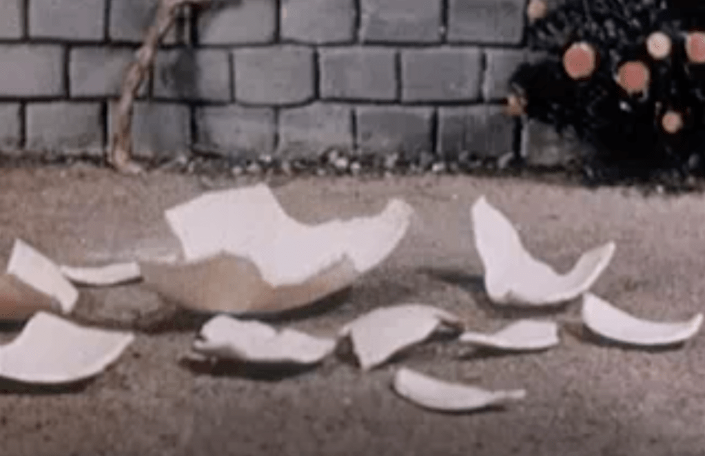 Note: For some sense of what was happening in the US in 1946 — possibly relevant to the poet’s use of Humpty Dumpty imagery — note that a new film short, “Mother Goose,” was released that year. The entire film, an early example of stop-motion animation created by Ray Harryhousen, is available via Archive.org and other sources. Humpty Dumpty appears at about 7:45 in the 12-minute film. (Image descriptions below.)
