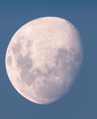 Image is of the waning gibbous moon — more moon visible on the left, than not — is a bright near-sphere, meant to suggest, if not really resemble, an egg; it shows craters, which might stand in for “fragments.” Moon is set against a dark blue background.