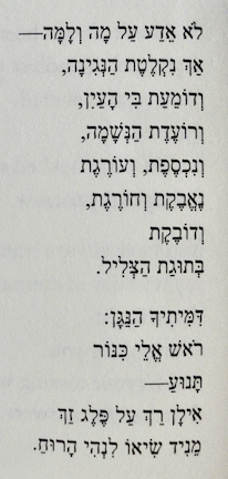 “To the Musician [Lanagid],” was originally published in Hebrew in 1947 as part of a collection called Netafim/Droplets. It is followed by eight untitled stanzas which form an arc that will likely be familiar to many struggling with memory and grief, especially in time of turmoil.