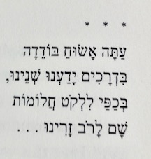 Finally, by stanza eight, she is walking alone, “in her palms [בְּכַפַי] to gather [לִלְקֹט] dreams [חֲלוֹמוֹת]” scattered on a path once shared. (More on gathering to come.)