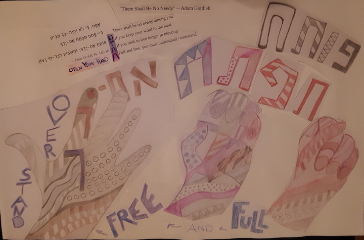 Alt Text: Three hands: one in a fist, one opening, and one fully open with the words Full >> and >> Free >> Overstand across the three. Above hands are the words “Poteach Tiftach et Yadekha” in Hebrew block letters. Image collage also includes Hebrew text of Deut 15:4, 8 and Ps 145:16 plus Adam’s lyrics and the words “Open Your Hand.”