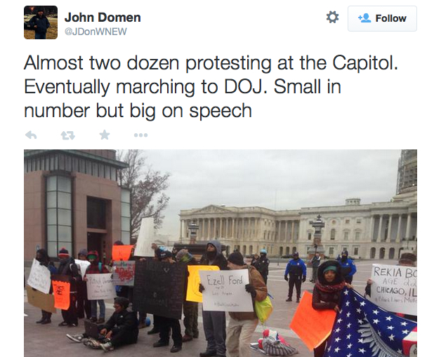 I symbolically embodied Rekia Boyd during a demonstration at the U.S. Capitol followed by a 4-1/2 hour die-in at the Department of Justice on Human Rights Day, December 8, 2014. I chose her name because she was female (like me) and from Chicago (like me). And while I had already left the city by the time I was 22, I feel some connection with a young woman out with friends on her own streets, maybe forgetting that it was late and time to keep the noise down or maybe just forgetting — as my friends and I did often enough — that there were other people around.