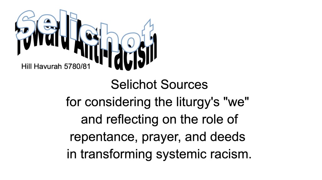 Selichot Sources: Toward Anti-Racism prepared by Rachel Conway and Virginia Spatz, for Hill Havurah, with advising from Rachel Faulkner, National Jews of Color Organizer, Dimensions Educational Consulting.